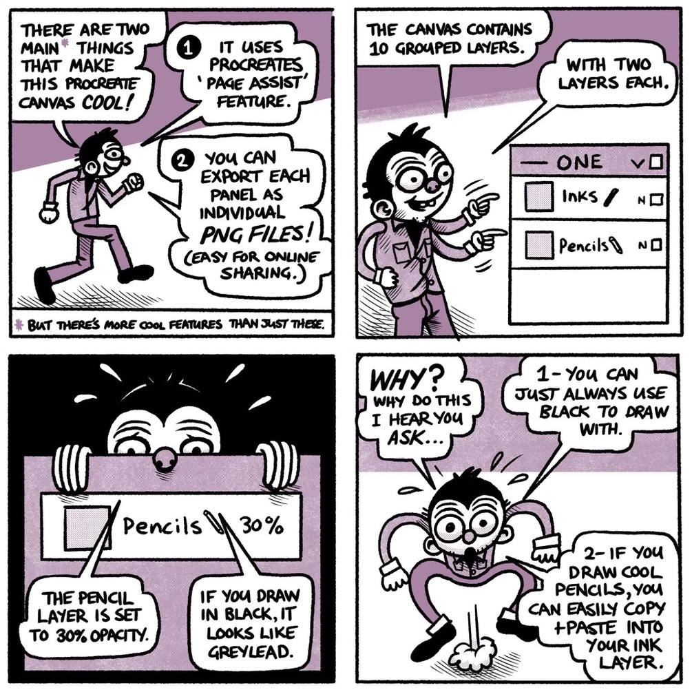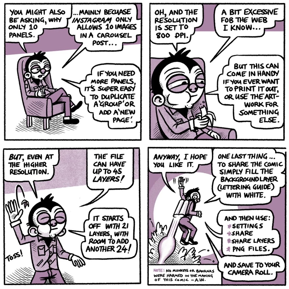 Designed for conveniently sharing comics made in Procreate for Instagram. There's nothing particularly special about this file, except for the time I put into making it and the ease in which it will take, sharing it to Instagram.